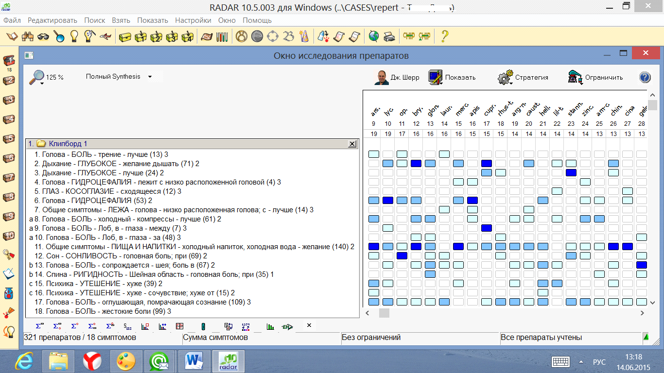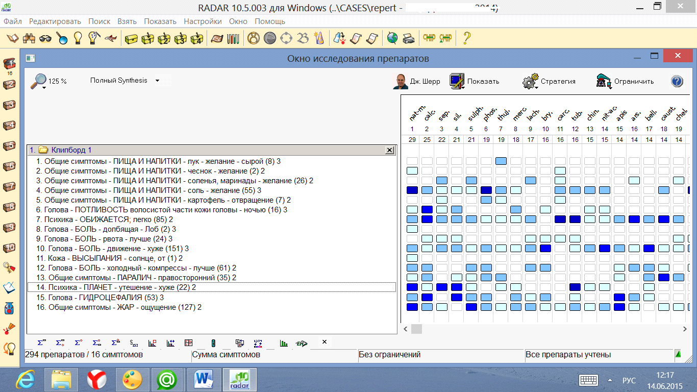 Пациент пришел на прием с жалобой, что приступы головной боли вновь усилились. Несколько уменьшилась плаксивость (на 30%),остальные симптомы без изменений. Рекомендовано принимать Natruium muriaticum 14с ежедневно.