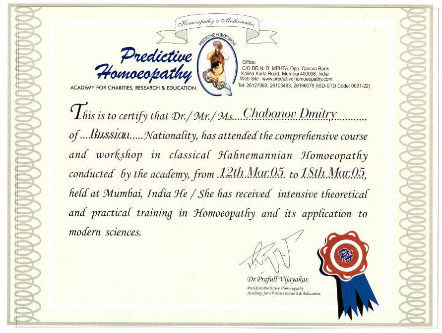 В 1991 г. Прошел обучение в Советской Гомеопатической Лиге.