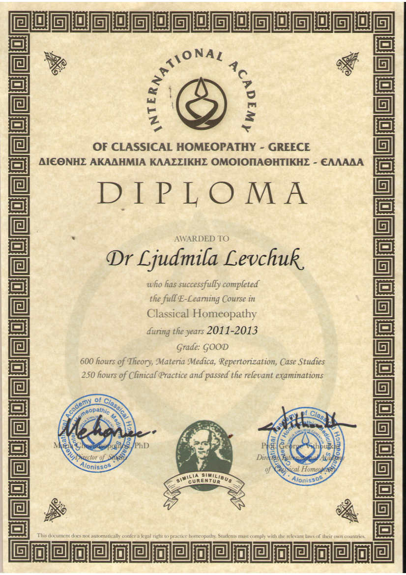 2011-2013гг. – повышение квалификации в Международной Академии Классической гомеопатии (проф. Дж. Витулкас).