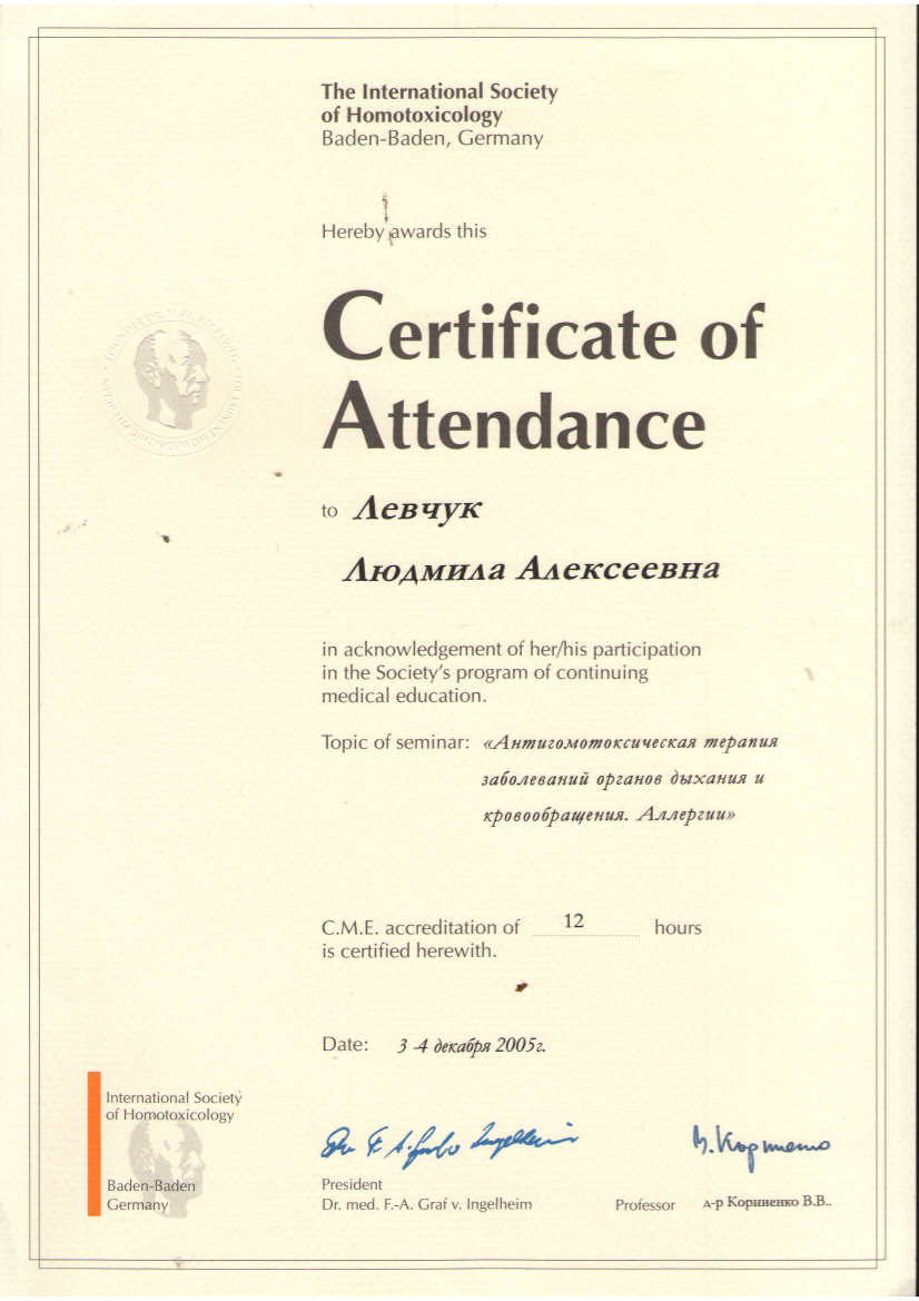 Ежегодное участие в гомеопатических семинарах и конференциях.