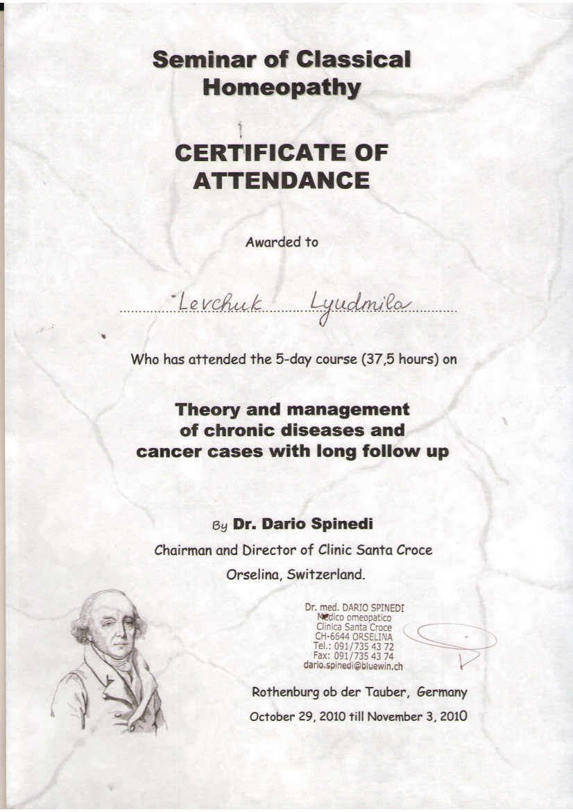2008, 2010 гг.- выездные семинары доктора Спиннеди (Швейцария) « Использование гомеопатии в лечении пациентов с онкологией»