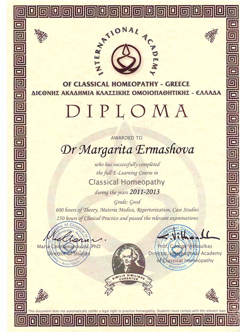 2011-2013 г.- обучение в «Международной Академии Классической Гомеопатии» ( Дж. Витулкас)